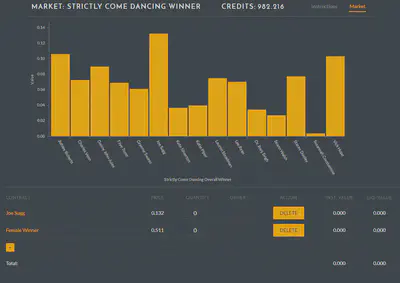 To trade, you select the “markets” icon (the four panels) and then select a market, e.g. the “Strictly Come Dancing Winner” market. This demonstration market is for predicting the winner of the 2018 series of BBC’s Strictly Come Dancing programme (Americans will know this programme as Dancing with the Stars). In the programme 15 celebrities compete at dancing with one celebrity being ejected from the competition each week. This market is, as the British election commentator Peter Snow might say, “just a bit of fun”, but it illustrates many of the key features of AGORA. This market has 15 distinct outcomes. In all AGORA markets, outcomes are Mutually Exclusive and Comprehensively Exhaustive (MECE): this means that only one outcome can occur but one outcome must occur.