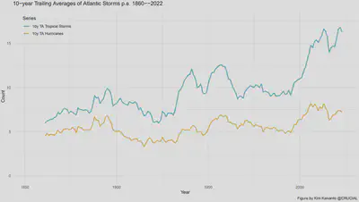 During this period, the 10-year Trailing Average of Atlantic Hurricanes also rises above previous historical highs.